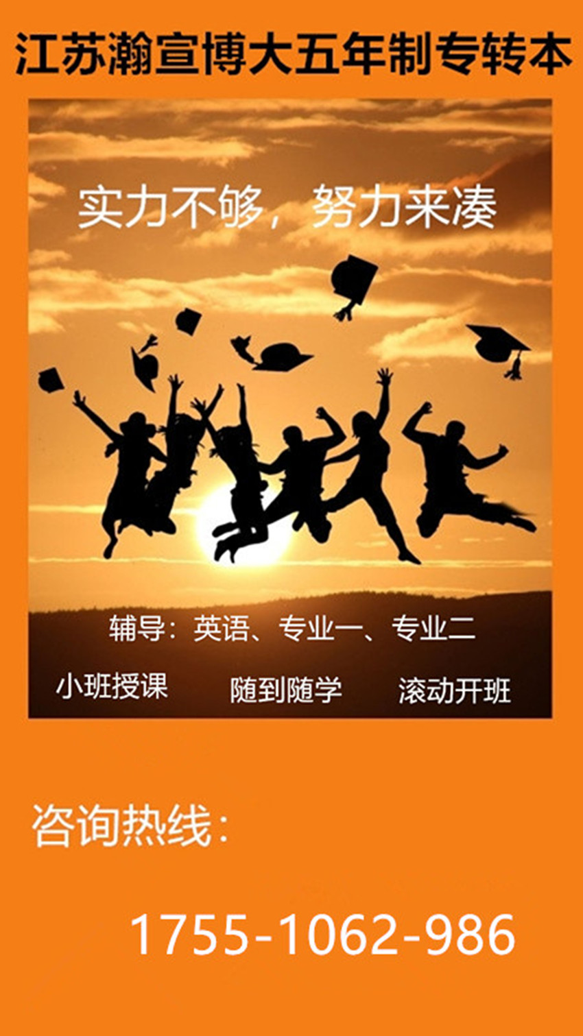 江苏瀚宣博大专转本面向江苏13市高职院校1-5年级转本备考生进行招生,全年滚动开班,随到随学,一次报名可循环上课至考前,越早报名课时量越多,基础越扎实,还根据考生不同学科、不同基础和学习能力强弱的差别进行分班授课,做到因材施教,查漏补缺,培优、补良、拔高,快速提高学生的学习能力,提高备考的效率。更多详情咨询1755微1062同986严老师,可预约免费测试或试听,领取招生简章一份。