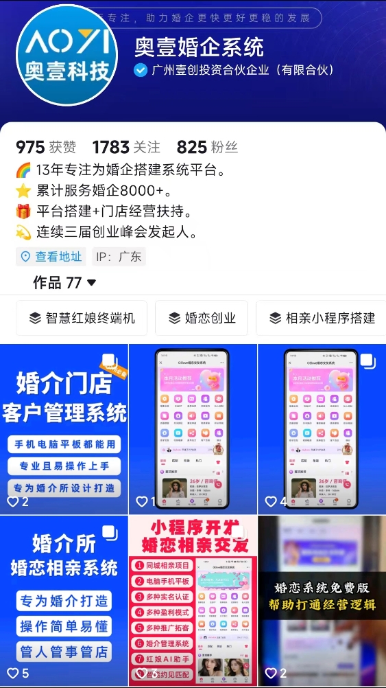 描述:奥壹云婚恋建站系统(简称:奥壹云)是奥壹科技旗下的一款超大型婚恋云建站平台,以SAAS平台服务方式为全国婚恋企业提供会员在线互动及内部服务跟进管理的婚恋相亲平台快速搭建,通过专业的运营课程与陪跑服务共同扶持全国婚恋创业者、经营者共同成长,为中国婚恋幸福事业发展做出贡献!