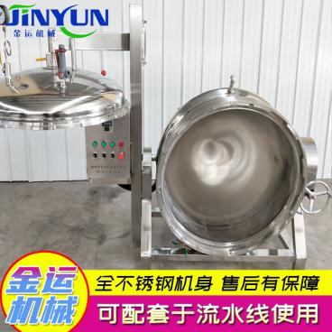 高压蒸煮锅工作原理高压蒸煮锅是以一定压力的蒸汽为热源(也可选用电加热)的高压设备,该设备具有受热面积大,加热均匀、物料沸腾时间短、加热温度容易控制、多种物料任意蒸煮等特点。可缩短蒸煮熬制时间,降低蒸煮。 在现代食品行业的应用已经很普遍,不仅应用于糖果、制药、乳品、酒类、糕点、蜜饯、饮料、罐头、卤味等食品的加工,也可用于大型餐厅或食堂熬汤、烧菜、炖肉、熬粥等,是食品加工提高质量、缩短时间、改善劳动条件的良好设备。1、容积:50L~1000L不等。2、结构形式:分可倾式、立式结构,按工艺需要采用带搅拌与不带搅拌。3、锅体材质:一.内锅体不锈钢(SUS304),夹套、支架碳钢(Q235—B)外涂防锈漆;二.内外全不锈钢。4、带搅拌装置锅体:顶部中心搅拌,减速机输出轴与搅拌桨轴采用活套连接,方便拆装与清洗。5、搅拌转速:36r/min(可以根据客户要求来选定一定的转速);搅拌桨形式:普通搅拌(锚式)和刮底搅拌。6、支脚形式:一.立式锅体:三棱锥形式、圆管式;二.可倾式锅体:槽形支架式。7、设备配置:表盘指针式温度计、蒸汽进口、出料口等(立式结构)。8、可倾式蒸煮锅体可倾转90°,倾转方式为手动式翻转。9、有电加热/燃气加热/蒸汽加热三种加热源客户可自行选择。10、设备使用法兰密封盖,可采用液压自动开盖设计、法兰快开设计、螺栓手动开盖三种方式。11、根据客户蒸煮工艺不同,可带内筐,带搅拌,带底部出料结构,使用更方便。注:夹套工作压力、电机功率、加热功率、搅拌浆结构等可根据客户特殊要求定做。