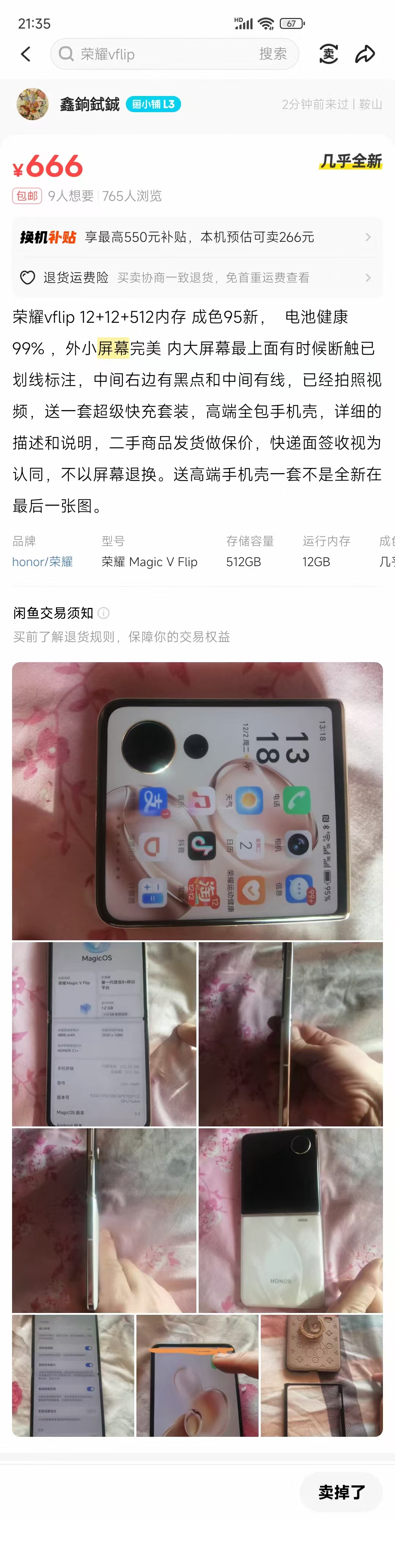 2025-12-27 在闲鱼平台上,下单购买一台荣耀vflip折叠旧手机。