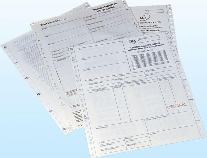 专业印刷空运提单印刷,海运提单印刷,物流提单印刷等应用于国际货运代理、国际空运、国际物流、集装箱码头、国际船务公司常用办公表格用纸。提供有不同提单版本及各种背书条款,能够适用于大多数公司的要求、规格为12*9.5英寸、单张单联提单一式六联或多联;本产品采用高级无碳复写原纸,标准电脑孔位,配页整齐,具有无碳复写、压感清晰、电脑连续打印、易于管理等特点。