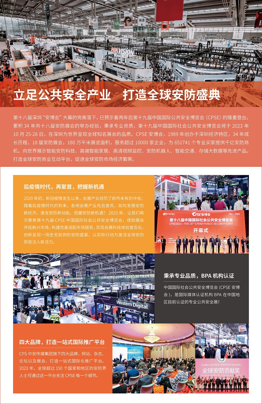 中国国际社会公共安全博览会(简称“CPSE安博会”)1989年成立于深圳经济特区,19届专业展会34年成长历程,是全球具有影响力的智能安防展览会。