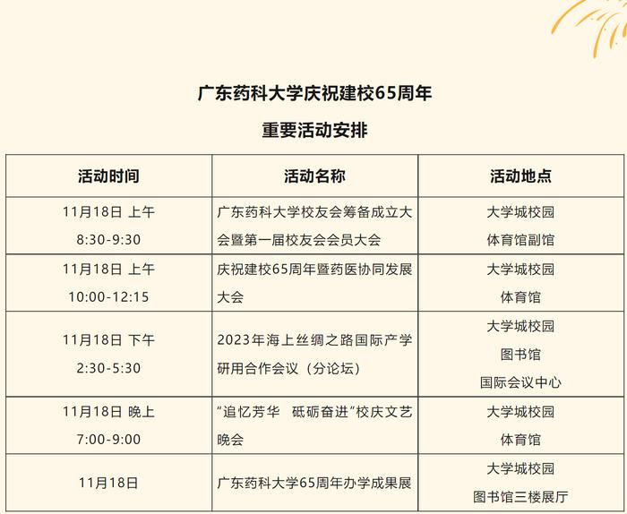 广东医科大学将于11月18日隆重举行广东药科大学庆祝建校65周年暨药医协同发展大会。主要活动安排: